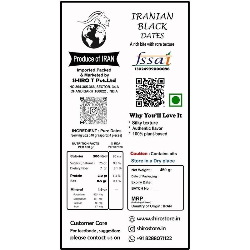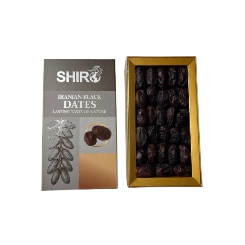 This date comes from the south of Iran , especially from the Hormozgan province. Iranian Black Dates grow on tall palm trees under hot and humid conditions. They are hand-picked and sun-dried naturally. These dates have a dark color, a chewy texture , and a mildly sweet taste. Shiro workers carefully clean and pack each date. Only the best are selected to send to India, bringing you a premium, natural treat.