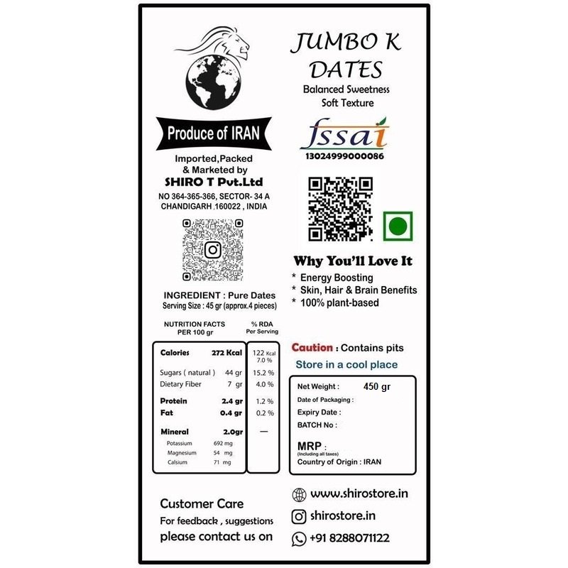 This date comes from the southeast of Iran , mainly from Kerman province. Jambo K dates grow on tall palm trees in hot and sunny weather . They are picked by hand and dried naturally under the sun. Jambo K dates are soft and sweet, but a little drier than Mazafati . Shiro workers clean and pack each date with care. We select the best ones to send to India , so you enjoy their natural flavor and quality.
